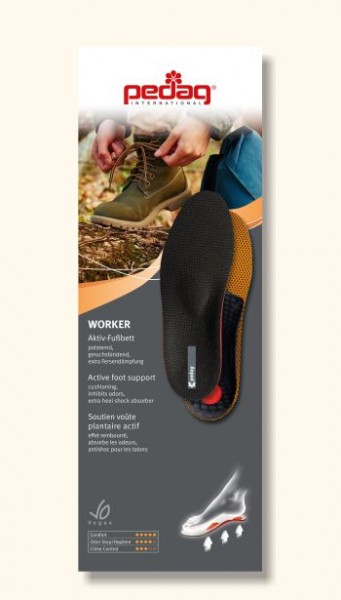 As palmilhas pedag® Worker são indicadas para sapatos de trabalho e de caminhada, pois permitem um andar mais relaxado e mais higiénico: moldado anatomicamente, superfície de corrida resistente à abrasão, carvão ativado no enchimento de látex contra maus odores.
