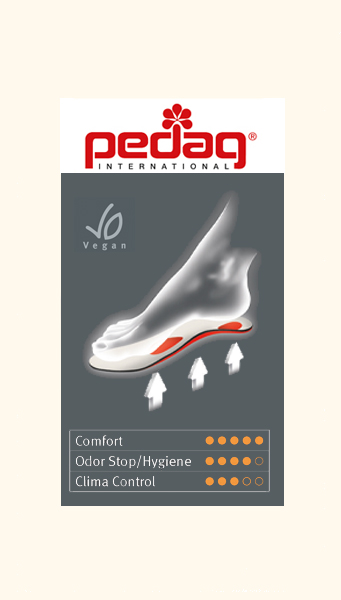 O arco longitudinal suporta e previne os sinais de fadiga, a almofada metatársica no antepé previne as queixas de pé aberto e pode aliviar problemas existentes. Tudo isto tornam as palmilhas para pés ativos pedag® Worker um conforto real adicional em sapatos robustos e botas.