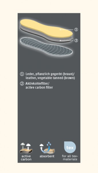 Estas palmilhas extra finas são uma promessa de higiene para os seus pés e sapatos! O couro fino curtido com vegetais (marrom) das palmilhas, absorve a humidade, graças ao filtro de carvão ativado de alto desempenho. Os maus odores, aqui não têm lugar! Assim, pés, meias e sapatos ficam frescos o dia todo.