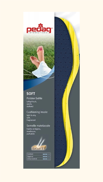 A palmilha pedag®️ Soft é constituída por um forro de tecido preto e espuma de látex macia. Testada dermatologicamente, com uma agradável fragrância de limão, a pedag®️ Soft fornece uma camada acolchoada que é perfurada para melhorar a circulação de ar. Adequada também para pés sensíveis. Lavável à mão com sabão neutro e deverá ser seco ao ar.