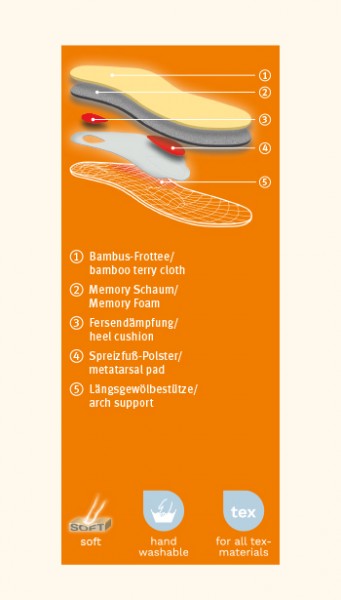 A fibra de bambu macia e particularmente higiénica na parte superior absorve cerca de 60% mais humidade do pé do que o algodão e garante um clima higiénico no calçado. As fibras de bambu também secam cerca de 20% mais rápido do que o algodão e são naturalmente antibacterianas. Remova a palmilha pedag® Sneaker Magic Step dos seus sapatos depois de usá-las e areje-as durante a noite. É melhor usar dois pares, alternadamente!