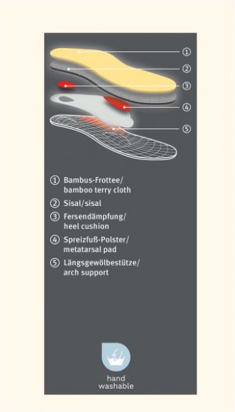 Estas palmilhas impressionam pela leveza: a arejada fibra de sisal envolve os seus pés como se estivessem nas nuvens, a superfície de algodão macio e felpudo cuida da pele e absorve a humidade. A prata integrada elimina os maus odores. Para uma ótima sensação de bem-estar, mesmo quando os pés estão sem meias!