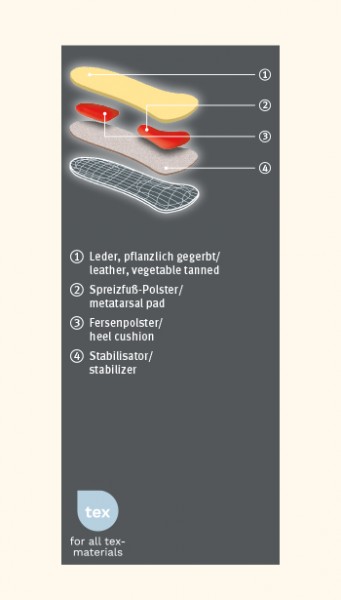O couro vegetal curtido na parte superior do apoio do pé raso absorve a humidade que se desenvolve no pé durante o dia e, assim, garante um clima agradável dentro do calçado. pedag® Comfort é perfeita para sapatos baixos e confortáveis e oferece a quantidade extra de suporte e conforto de que você precisa para problemas do pé raso.