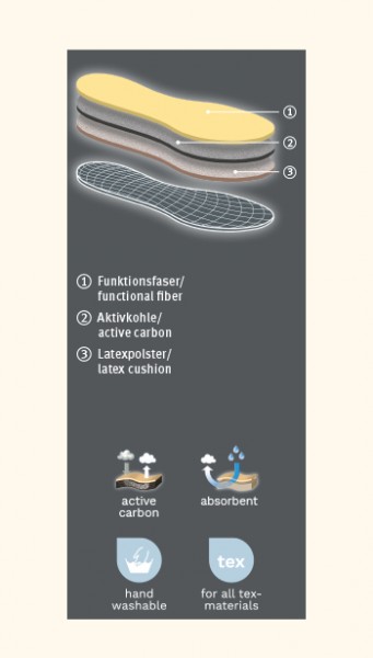 A espuma de látex macio amortece o pé confortavelmente e é perfurada para que o ar possa circular melhor no calçado. Isso também contribui para um clima higiénico no calçado. Não importa o quão ativo esteve hoje e quão ativo você estará amanhã - suas palmilhas de carvão ativado precisam de um dia de folga e precisam de ser retiradas do calçado para ventilar. O melhor é ter dois pares e usá-los alternadamente.
