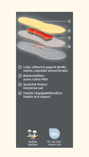 A parte de cima da palmilha flexível é feita de pele curtida de maneira vegetal respirável (versão branca), absorve a humidade e permite que o pé respire. O filtro de carvão ativado neutraliza eficazmente os maus odores. O conforto das palmilhas proporciona sempre um sentimento de despreocupação – mesmo ao retirar os sapatos no fim de um longo dia de trabalho. Para assegurar que as palmilhas podem ser usadas novamente no dia a seguir, deixe-as a arejar sempre depois de usar.