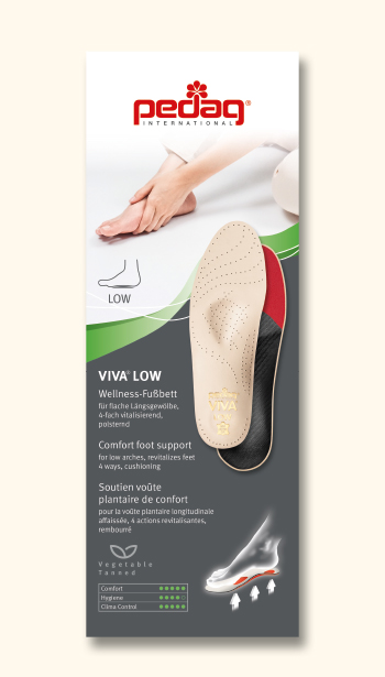 Muitas pessoas com arcos descaídos procuram uma palmilha que dê suporte ao pé, para aliviar toda a sua superfície e que esta seja macia e suave. A pedag® Viva® Low proporciona o bem-estar dos pés sendo adequada para pés sensíveis.