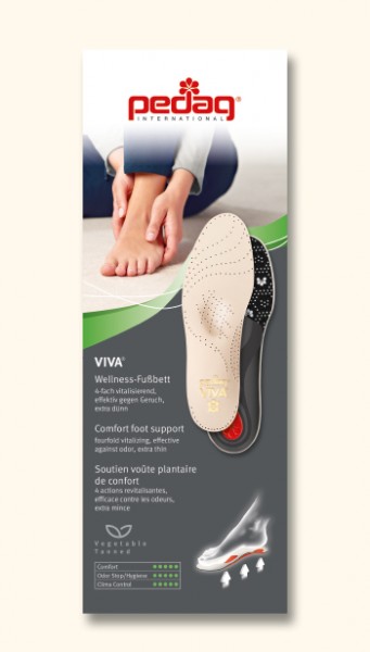 As palmilhas combinam fibras naturais finas com um revolucionário apoio para os pés, oferecendo suporte em três pontos nevrálgicos: arco longitudinal, calcanhar e antepé. Esta associação permite-lhe começar a noite com os pés relaxados, porque o seu programa de bem estar acompanha-o durante todo o dia! Pés cansados e exaustos? Não o afeta. A palmilha pedag® Viva® transforma qualquer calçado num calçado confortável num instante... Uma palmilha também pode ser atraente.