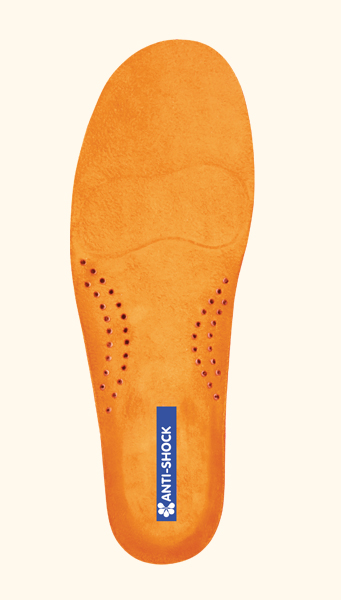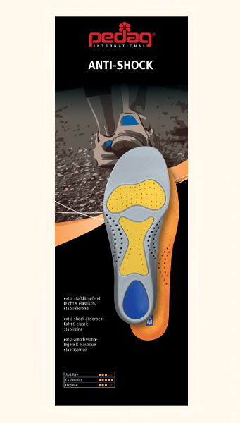 O nome diz tudo: com a palmilha desportiva pedag® Anti-Shock, a capacidade de absorção faz com que o impacto seja diminuto. Adapta-se perfeitamente ao pé. Os elementos adicionais de absorção de choque reduzem a energia que atua sobre o pé ao pisar. As palmilhas desportivas protegem os pés, joelhos e articulações da anca, bem como a coluna lombar e o pescoço.