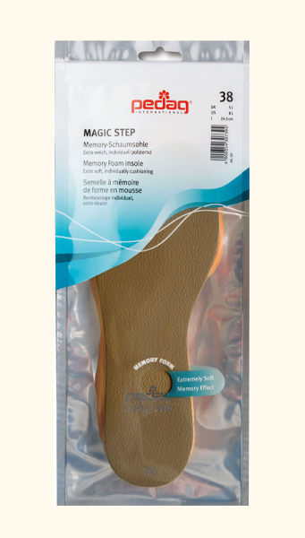 A sola de couro com espuma viscoelástica dá uma sensação de relaxamento para os pés perfeita. Se deseja uma almofada especialmente macia para os pés, a espuma viscoelástica torna isso possível - com efeito imediato. A pedag® Magic Step adapta-se ao formato do seu pé. Isso vai permitr que o seu pé se acomode da forma ideal. Permite aliviar o pé, proteger a coluna e as articulações.