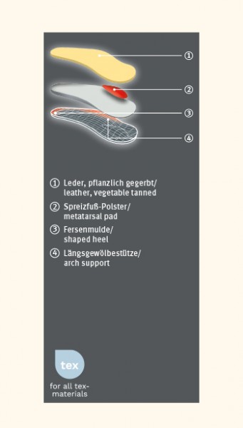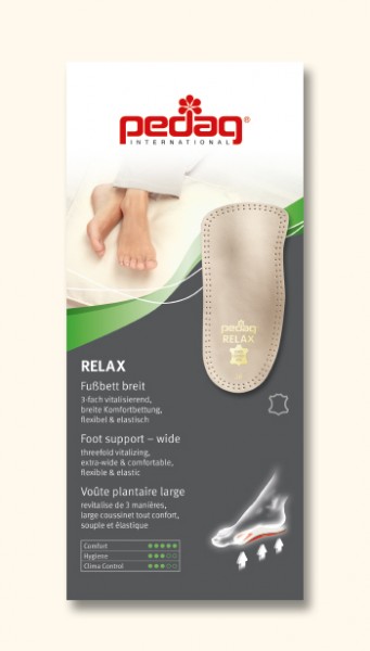 Gostaria de poder tirar os sapatos à noite de forma descontraída? Sem problemas graças à confortável palmilha curta Relax. Esta palmilha cumpre o que o seu nome promete: é elástica e particularmente flexível, amortece o antepé e evita que o pé se espalhe. O suporte do arco longitudinal suporta o pé, o calcanhar é suavemente acamado. Isso dá a todo o pé uma pegada saudável. Graças ao formato curto, os dedos têm todo o espaço de que precisam.
