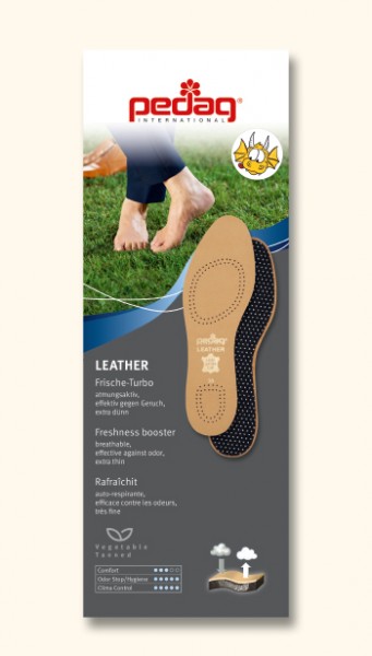 Os pés das crianças também transpiram! As palmilhas infantis pedag® Leather Kids ajudam a manter a higiene saudável dos sapatos. Uma brisa de frescura para o calçado infantil - as palmilhas de couro pedag® Leather Kids acabam com os cheiros desagradáveis. As crianças vão sentir-se mais confortáveis.