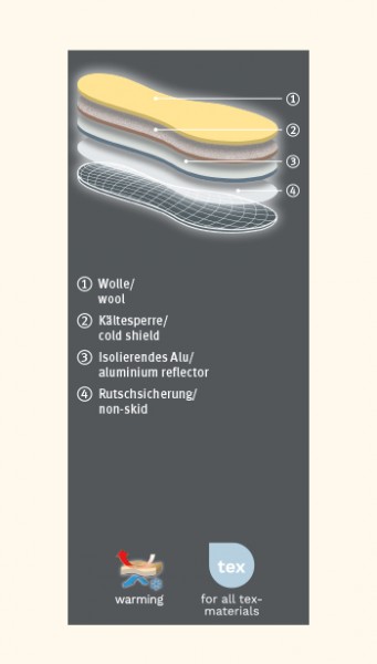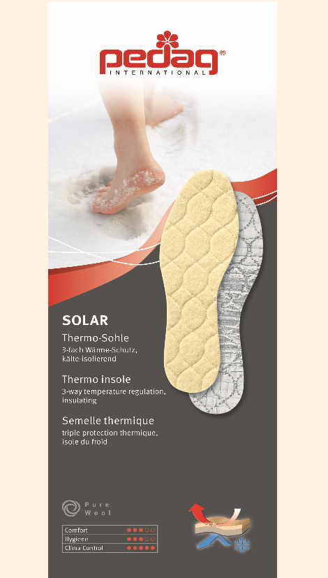 Na estação do Inverno, o frio rapidamente se instala nos seus sapatos. As palmilhas pedag® Solar garantem o aquecimento dos pés. O seu triplo segredo: pura lã de carneiro acolchoada, mantêm os pés quentes, a camada intermediária feita de espuma de alta tecnologia, na qual muitos milhares de pequenas bolhas de ar estão contidas, isolam os pés do contacto com a sola do calçado e a folha de alumínio especial na parte inferior reflete o frio e também protege contra a humidade.