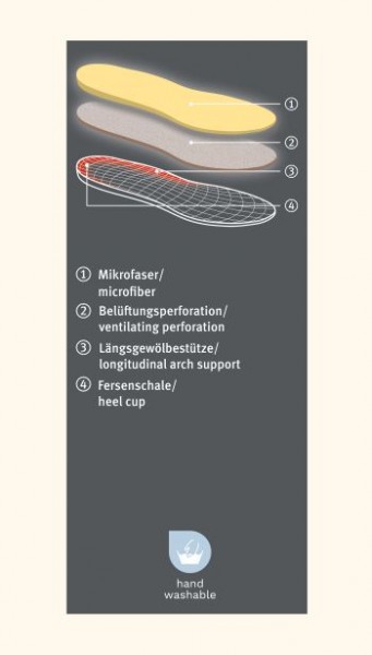 Ao mesmo tempo, a palmilha das crianças envolvem completamente o calcanhar e dá aos pequenos aventureiros entre dois e doze anos um suporte estável e confortável. A superfície feita de veludo de microfibra macia é confortável na pele, antiderrapante e mantém os pezinhos higienicamente secos.