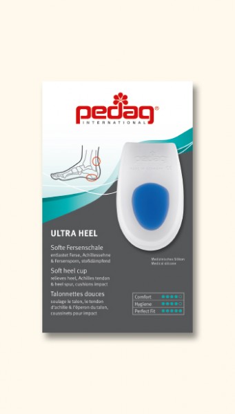 A calcanheira em gel viscoelástico que providencia um amortecimento completo durante a prática de desporto, no trabalho e na vida diária. As pedag® Ultra Heel podem aliviar as dores dos calcanhares, com duas zonas distintas que distribuem uniformemente a pressão: o gel fino amortece o calcanhar, o ponto em gel azul amortece particularmente o osso do calcanhar, aliviando-o.