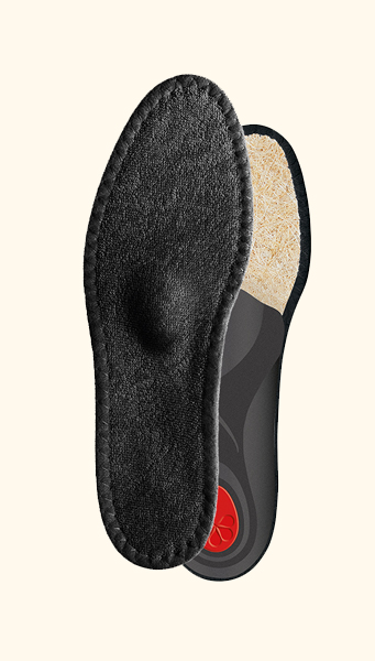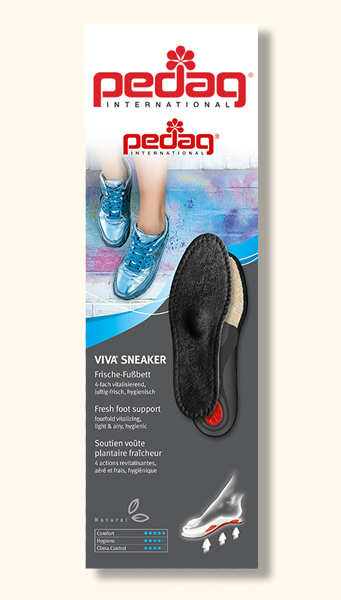 O estilo encontra o conforto: palmilha pedag® Viva® em preto moderno encaixa de forma perfeita nos seus pés! A palmilha pedag® Viva® Sneaker em veludo preto de algodão também é um prazer para os pés. Cuida e protege as áreas mais sensíveis do pé, enquanto absorve a humidade que não se pode acumular no interior do seu calçado. Isto mantém os seus pés confortavelmente secos.