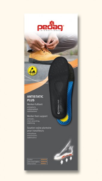 A pedag® Antistatic Plus aumenta significativamente o conforto e a higiene nos sapatos de trabalho, graças ao suporte dos pés EVA e uma camada absorvente de choques. A espuma especial amortece os choques e cargas. O suporte com forma anatómica dos pés suportam o arco longitudinal, e possui uma almofada metatársica suave, que alivia e previne a fadiga. Adicionalmente, a forma e amortecimento dos calcanhares distribuem a energia do impacto numa área larga. A palmilha antistática protege a coluna e articulações.