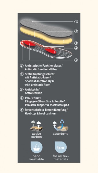 O filtro de carvão ativado integrado na palmilha também absorve o odor dos pés. Desta forma os seus pés ficam agradavelmente frescos – mesmo num longo dia.